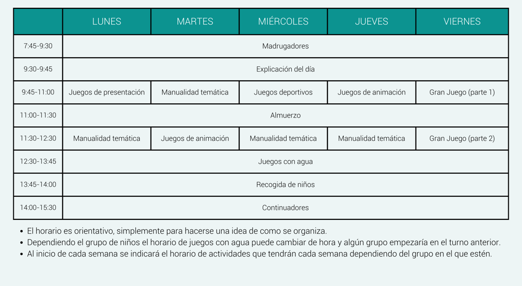 Todas las semanas disfrutaremos de juegos de animación, juegos deportivos, grandes juegos y muchas mas actividades al aire libre. Y a última hora de la mañana haremos juegos con agua para rebajar el calor.